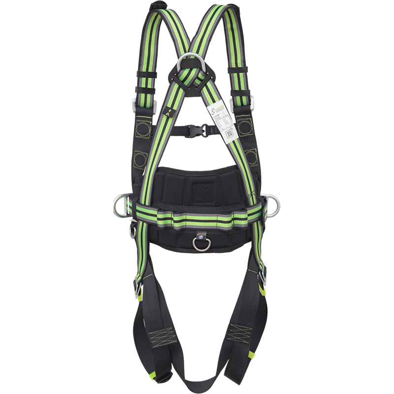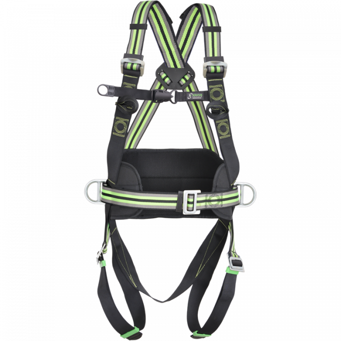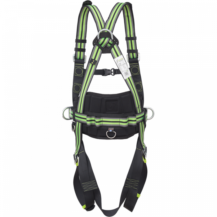 2 bucle textile pentru atasarea pieptului si un inel D pentru atasamentul dorsal pentru oprirea caderii, 2 inele D laterale pentru pozitionarea in munca.
