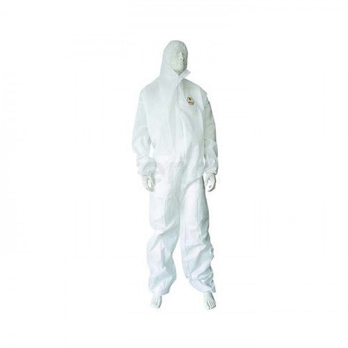 Combinezon cu gluga, deschidere in fata cu fermoar, acoperit cu fenta, fixata cu banda adeziva, elastic la spate in talie, mansete, glezne si gluga.