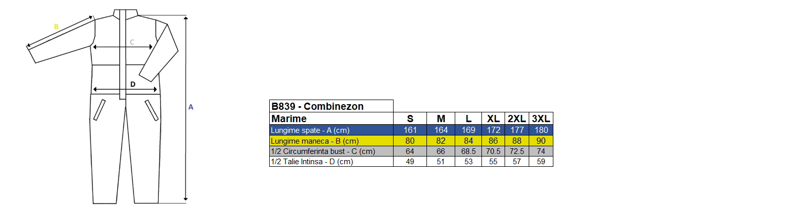 Combinezon cu gluga nedetasabila; maneci raglan, prevazute la subrat cu un orificiu de aerisire si terminate cu tiv si buton de ajustare pe mana; imbinari prin termosudare la interior.