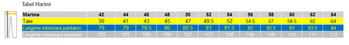 Marcare: Eticheta permanenta a produsului contine : codul, marimea, marcajul CE, dimensiunile corpului operatorului (circumferinta : torace, talie, inaltime), compozitia tesaturii, pictograme reprezentand instructiunile de intretinere,.