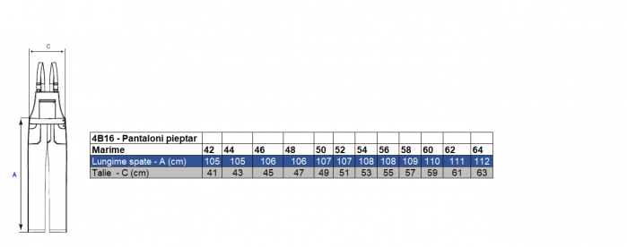 Pantalonul cu pieptar are multiple buzunare anterioare aplicate la nivelul soldului si pieptului si buzunare aplicate mai jos pe fiecare picior .Materialul de baza din care este confectionat pantalonul este tesatura tercot cu o compozitie 35% bumbac si 65% poliester si cu o greutate specifica de 235 g/mp . Culoare : albastru royal/galben neon.