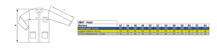 Marcare: Eticheta permanenta a produsului contine: codul, marimea, marcajul CE, compozitia tesaturii, dimensiunile corpului operatorului (circumferinta: torace, talie, inaltime), pictograme reprezentand instructiunile de intretinere.