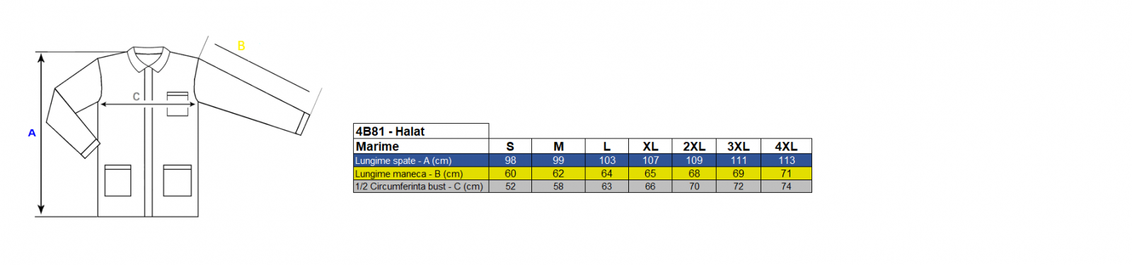 Marcare: Eticheta permanenta a produsului contine: codul, marimea, marcajul CE, compozitia tesaturii, dimensiunile corpului operatorului (circumferinta: torace, talie, inaltime) pictograme reprezentand instructiunile de intretinere.