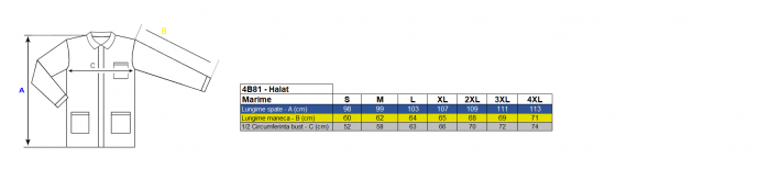 Constructie generala: Halatul are doua buzunare anterioare aplicate, dispuse simetric sub linia taliei si un buzunar aplicat pe linia pieptului; maneci drepte; sistem de inchidere frontal cu nasturi, acoperit cu o fenta.