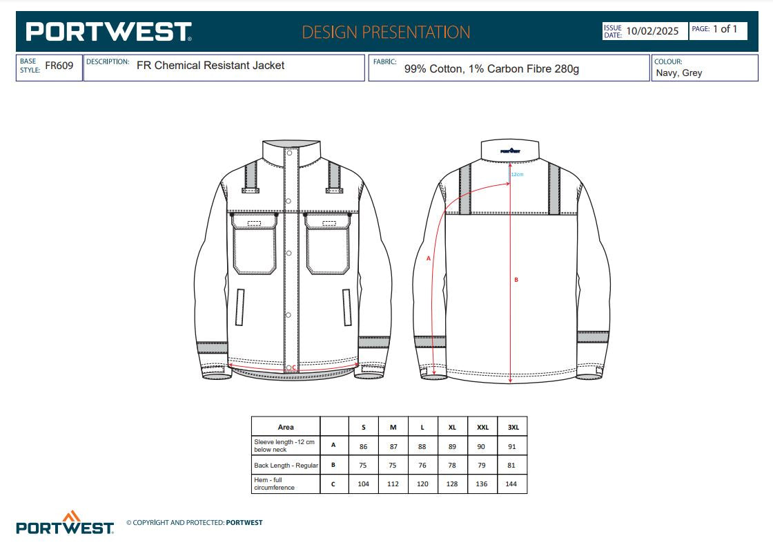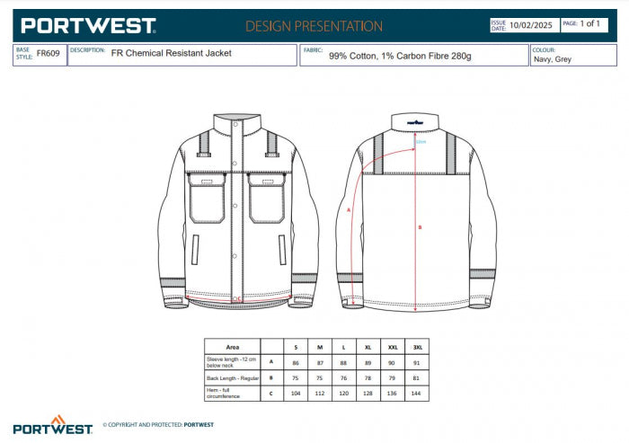 Jacheta de lucru Portwest FR609 Chemical Resistant, 9% bumbac, 1% fibra de carbon, 280gr/mp