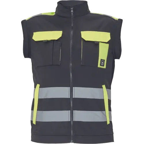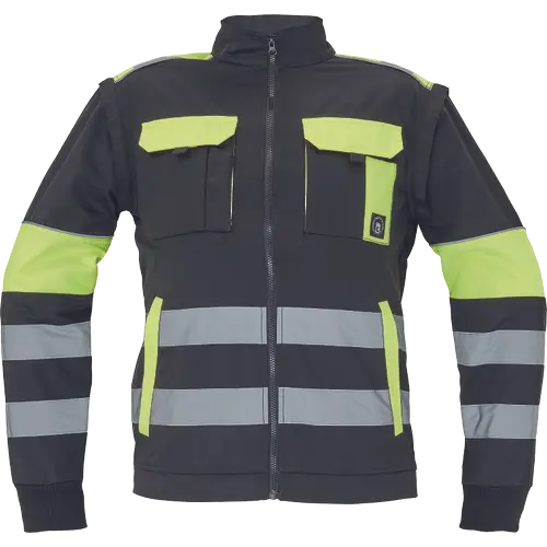 Jacheta de lucru reflectorizanta cu fermoar, maneci detasabile, 2 buzunare frontale, 2 buzunare la piept, intarirea zonelor tensionate ale coatelor si umerilor, benzi reflectorizante cusute in jurul soldurilor, manecilor si peste umeri, tiv reflectorizant care captuseste partile intarite ale manecilor si umerilor, mansete si circumferinta elastice