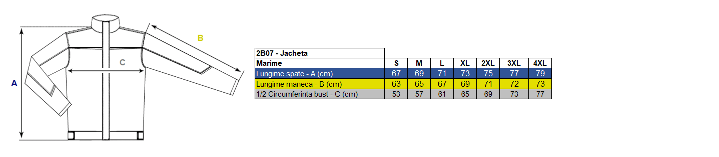 Caracteristici generale: Jacheta de protectie cu buzunare aplicate in partea frontala, sistem de inchidere frontal cu fermoar acoperit cu fenta. Intarituri la coat si mansete reglabile cu scai.