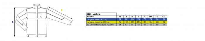 Constructie: jacheta cu inchidere in fata cu fermoar, snur de reglare, elastic in tiv, cu 2 buzunare inchise cu fermoar in fata, maneci drepte incheiate cu elastic la mansete.