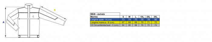 Marcare Eticheta permanenta a produsului contine : codul, marimea, marcajul CE, dimensiunile corpului operatorului (circumferinta: torace, talie, inaltime), compozitia tesaturii, pictograme reprezentand instructiunile de intretinere.