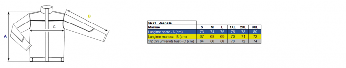 Marcare Eticheta permanenta a produsului contine : codul, marimea, marcajul CE, dimensiunile corpului operatorului (circumferinta: torace, talie, inaltime), compozitia tesaturii, pictograme reprezentand instructiunile de intretinere.