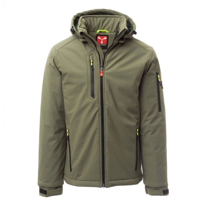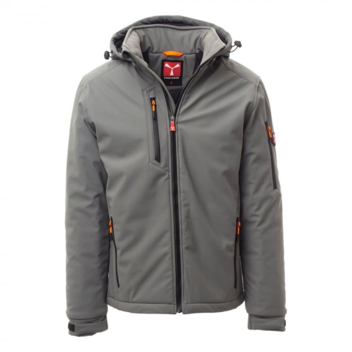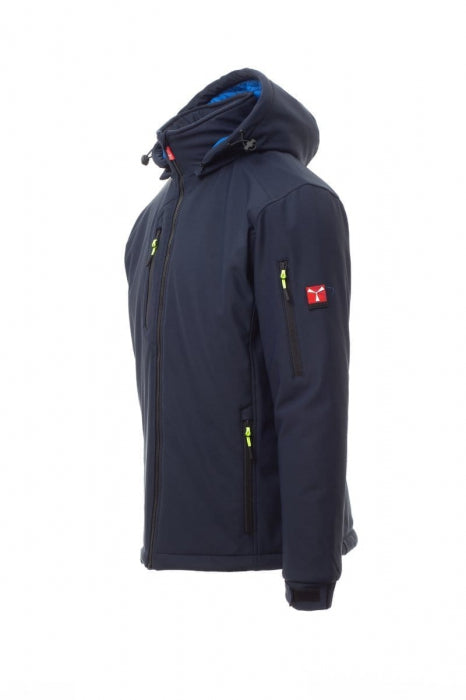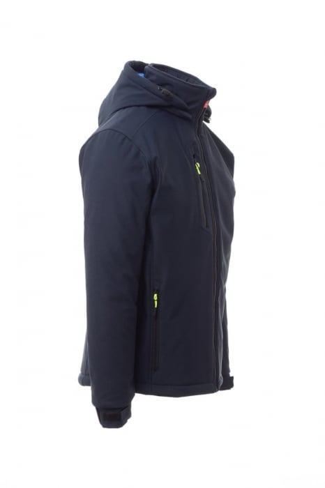 Jacheta softshell de iarna, cu gluga detasabila si accesorizata cu elemente reflectorizante. Confectionata dintr-un amestec de 78% naylon si 22% elastan, confortabila si respirabila si asigura o protectie sporita impotriva vantului (windproof) si impotriva apei (waterproof - WP 8000 mm H2O, WVT 5000 g/m2 24h). Captuseala interioara de tip fleece o face potrivita pentru vremea rece si friguroasa. Este echipata cu doua buzunare frontale, unul la piept si unul pe maneca stanga, toate asigurate cu fermoar. Inchiderea frontala se face cu ajutorul unui fermoar metalic cu sistem de semi-autoblocare