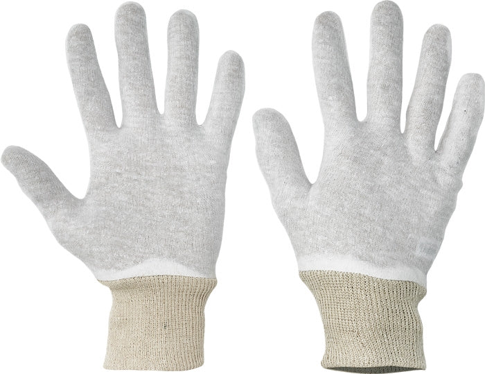 Manusi cusute din tricot interlock de bumbac fin albit + poliester, cu manseta elastica. Manusi atestate