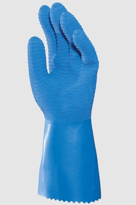 CONSTRUCTIE: manusa de protectie chimica, fara cusatura, cu 5 degete, grosime 1.35 mm., in interior suport textil, in exterior textura antiderapanta intarita, fara silicon;