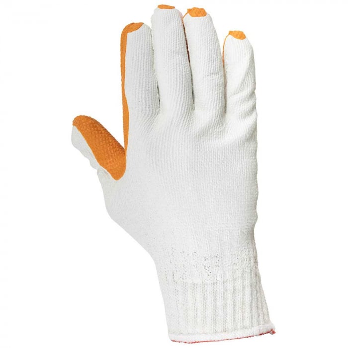 Manusi tricotate din fibre mixte cu strat de acoperire din latex de culoare portocalie, in palma si pe degete, cu manseta elastica din tricot.