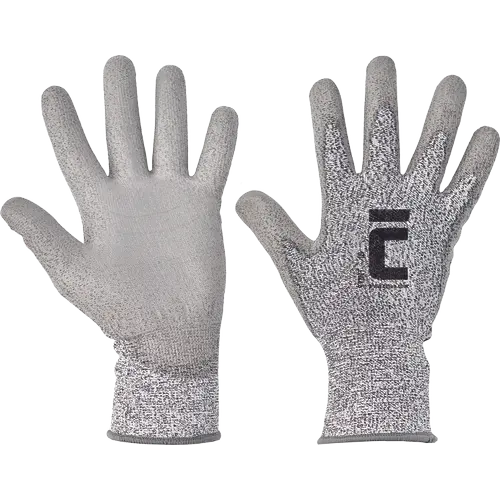 Manusi tricotate, fara cusaturi, rezistente la taieturi (nivelul B), cu strat de protectie gri din PU pe palme si degete.