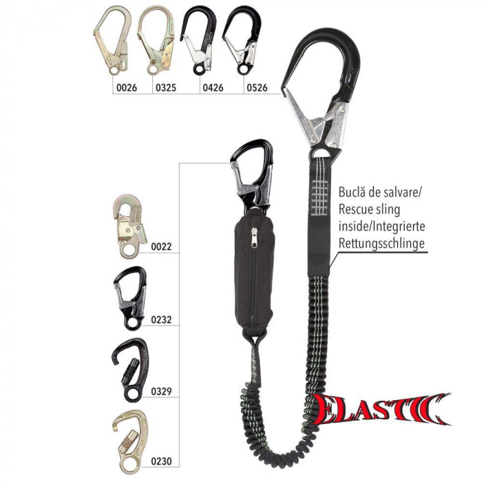 Mijloc de legatura elastic cu absorbitor de energie integrat si bucla de salvare. Confectionat din chinga elastica de rezistenta mare, cu latimea de 35 mm. Certificat conform EN 354 si EN 355. Bucla de salvare se auto lanseaza in momentul caderii,fiind accesibila salvatorilor atunci cand este nevoie. Echiparea cu carabine se face conform optiunii clientului. Lungimea maxima, in stare tensionata este de 1,9 m.