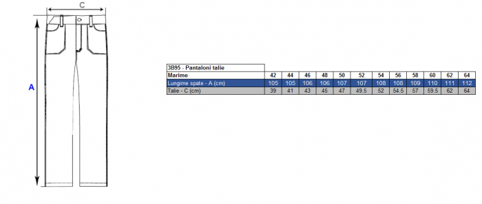 Materialul de baza din care este confectionat pantalonul este tesatura tercot cu o compozitie 35% bumbac si 65% poliester si cu o greutate specifica de 280 g/mp .