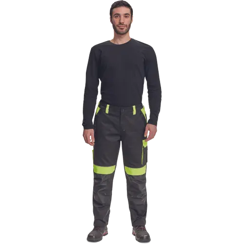 Pantaloni de lucru cu talie elastica, 2 buzunare laterale, 1 buzunar dublu lateral pe piciorul stang, 2 buzunare la spate, 2 buzunare mici la spate lateral pe piciorul drept, insertii reflectorizante, intarituri la genunchi Oxford 600D cu buzunare cu clapeta pentru genunchiere, posibilitate de extindere a lungimii cracului