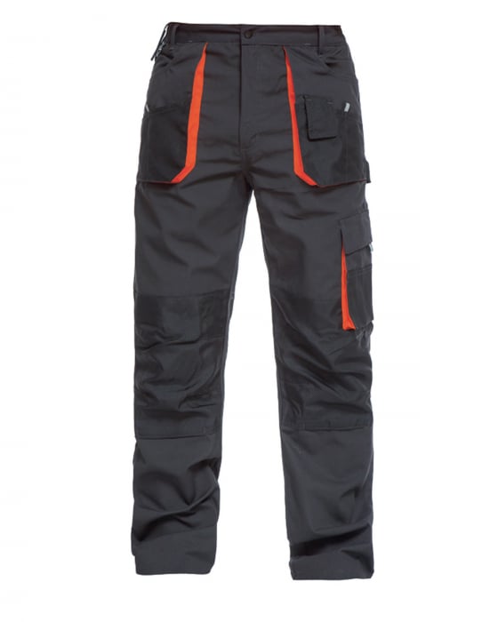 Pantaloni de lucru din tercot cu elemente din poliester Oxford 600D material rezistent la frecare, intaritura genunchi cu suporti genunchiere, buzunare laterale fata si spate tip burduf, nele pentru scule, talie elastica