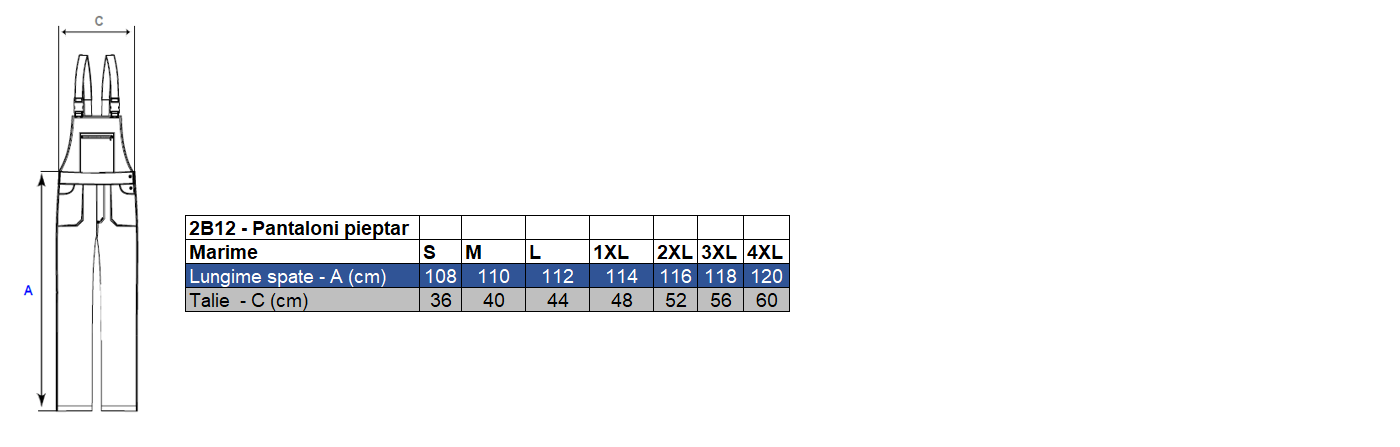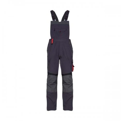 Pantalon cu pieptar cu buzunare multifunctionale din care un buzunar la piept acoperit cu clapa, doua buzunare in fata, doua buzunare cu burduf in spate, un buzunar aplicat lateral acoperit cu clapa si un buzunar pentru metru. Pantalonul are intarituri in zona genunchiului. Bretelele sunt ajustabile cu elastic si catarame.
