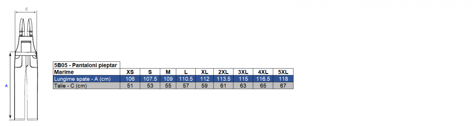 se incheie in fata cu slit incheiat cu fermoar; este prevazut cu pieptar, bretele elastice imbinate cu