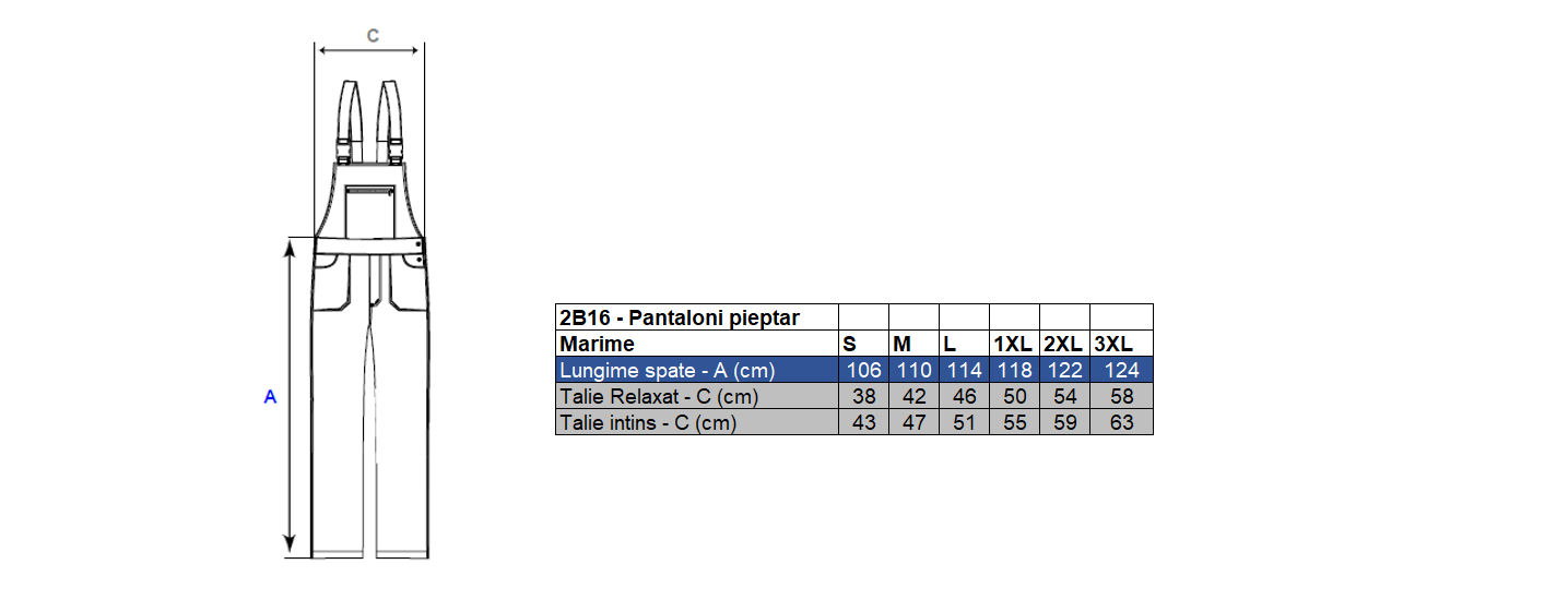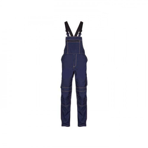 Pantalon cu pieptar cu buzunare multifunctionale din care un buzunar la piept inchis cu fermoar, doua buzunare in fata si doua buzunare aplicate lateral. Pantalonul are dublura in zona genunchiului pentru genunchiere. Bretelele sunt ajustabile cu elastic si catarame.