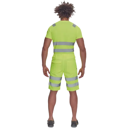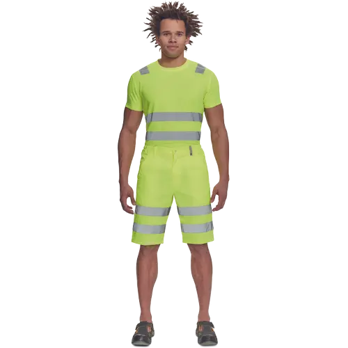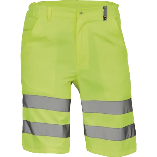 Pantaloni scurti de lucru, cu vizibilitate ridicata, cu benzireflectorizante de 7 cm latime, 2 buzunare laterale + 1 buzunar pentru monede, 2 buzunare la spate, talie elastica pe partile laterale