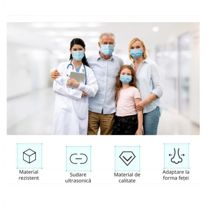Masca medicala tip II, conform standardului SR EN 14683, asigura o protectie eficienta impotriva tranferului de microorganisme si bacterii si pentru utilizarea generala de catre persoanele expuse la particule de praf sau alergeni.