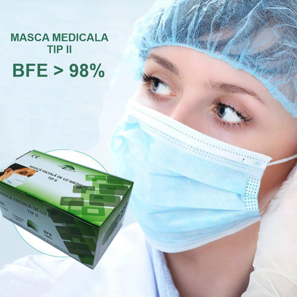 Masca medicala tip 2, conform standardului SR EN 14683, asigura o protectie eficienta impotriva tranferului de microorganisme si bacterii si pentru utilizarea generala de catre persoanele expuse la particule de praf sau alergeni.