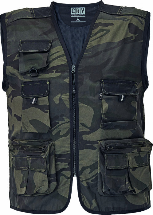 Vesta barbateasca usoara din stofa cu tesatura diagonala T/C de 190 g/m2, partial dublata cu plasa de nailon, 11 buzunare din care doua in partea din spate si unul pentru telefon, inchidere cu fermoar, design de camuflaj atractiv