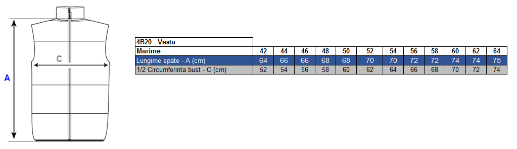 Marcare: Eticheta permanenta a produsului contine : codul, marimea, marcajul CE, dimensiunile corpului operatorului (circumferinta : torace, talie, inaltime), compozitia tesaturii, pictograme reprezentand instructiunile de intretinere,.