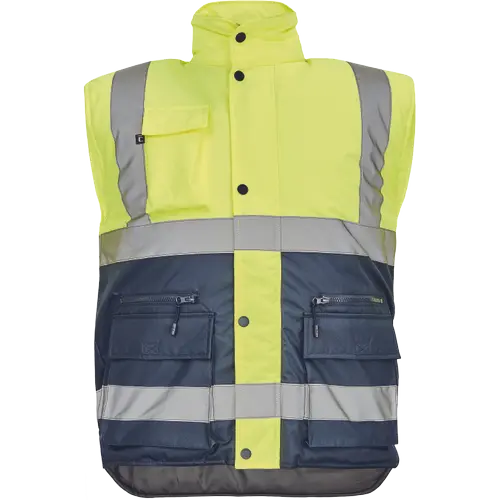 Vesta captusita integral, cu vizibilitate ridicata prevazuta cu gluga in guler, dungi reflectorizante pe umeri si partea de jos de 5 cm latime, inchidere cu fermoar acoperita cu clapeta prevazuta cu capse, 1 buzunar la piept pentru telefon, 2 buzunare mari in fata cu clapeta si 2 buzunare prevazute cu fermoar in partea superioara